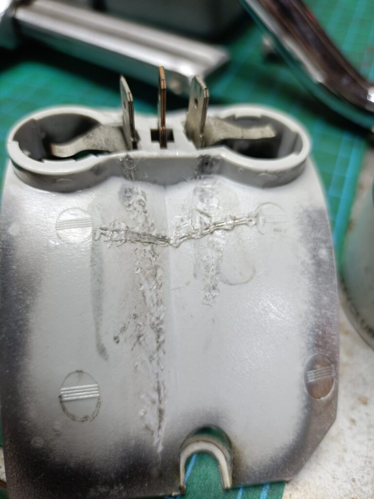 ひとまず、半田ごてに細い先っちょを組んで、ヒビ割れに