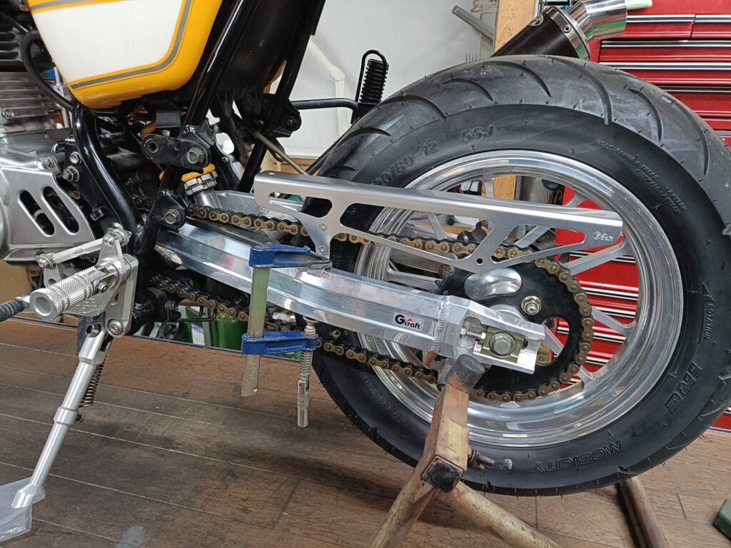 黄色エイプに組まれている社外品のスイングアームに