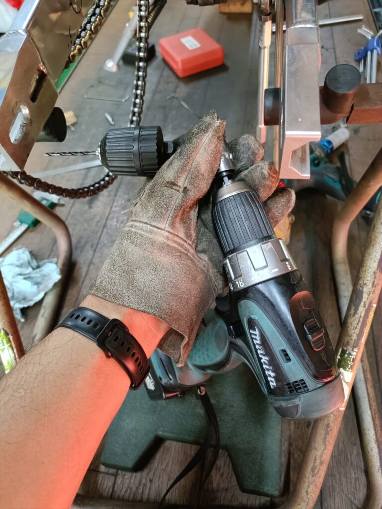 かなり強引に工具を組み合わせて、どうにかドリルが