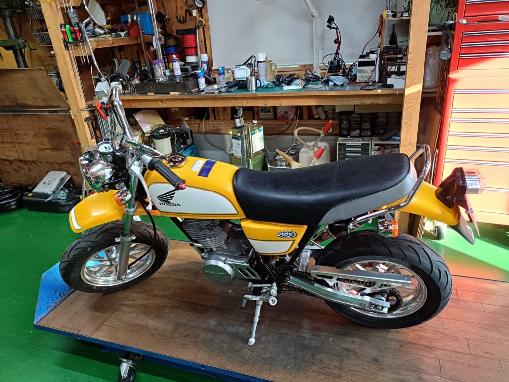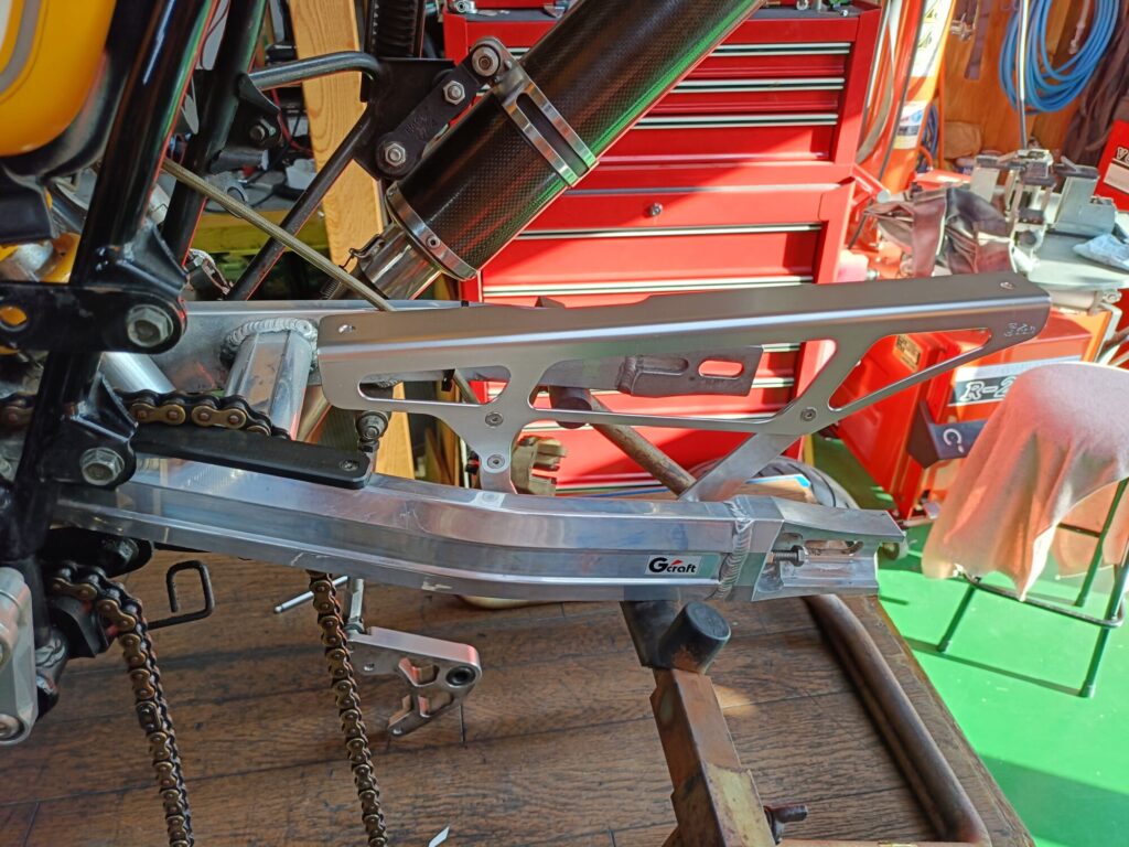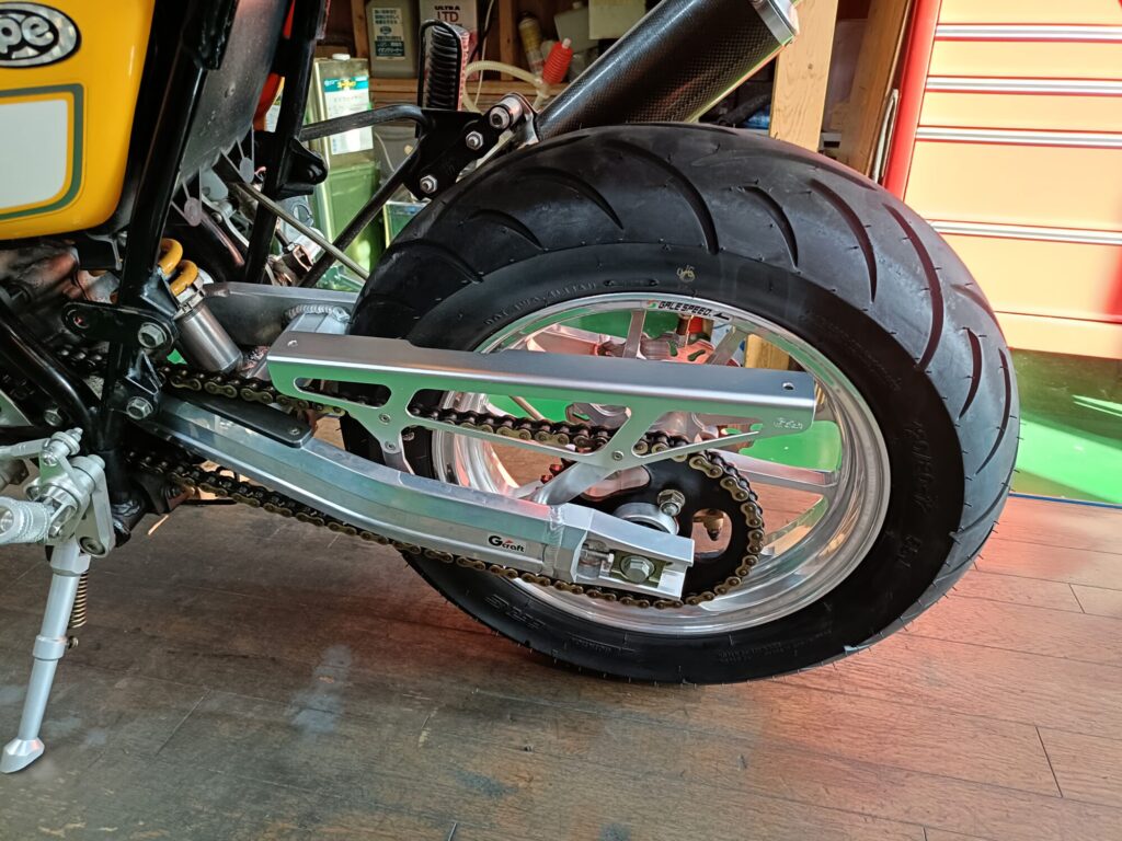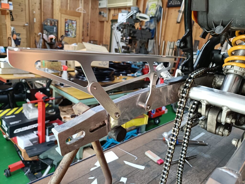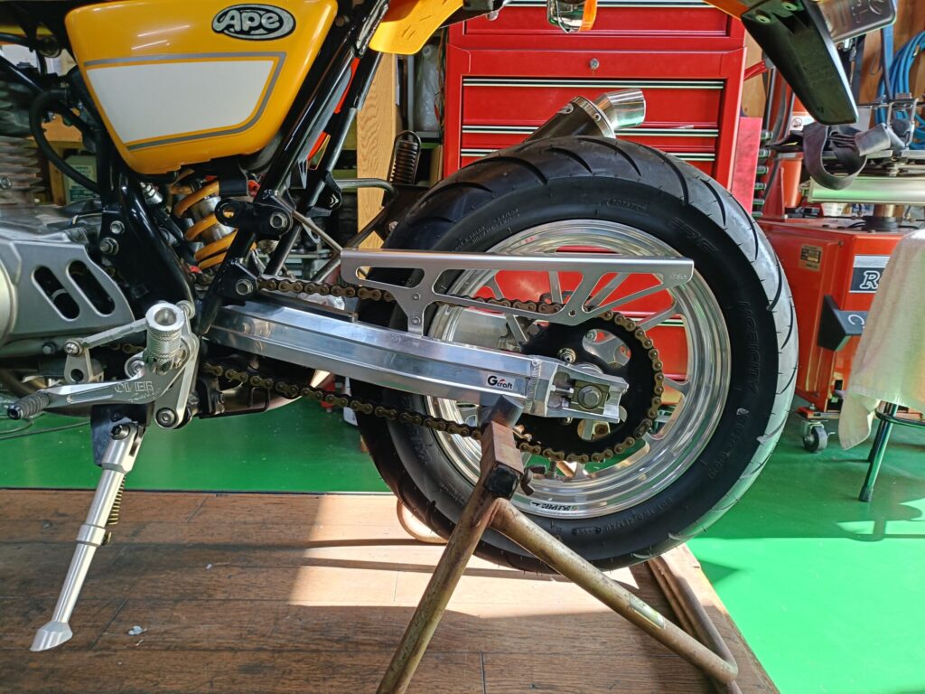 ホンダのエイプに組まれた社外製アルミスイングアームに