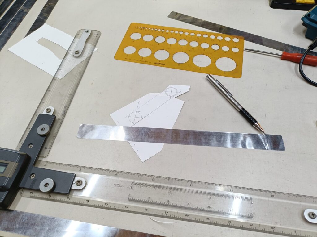 型紙を起こして、アルミ板に写し、切り出し。ネジ穴と