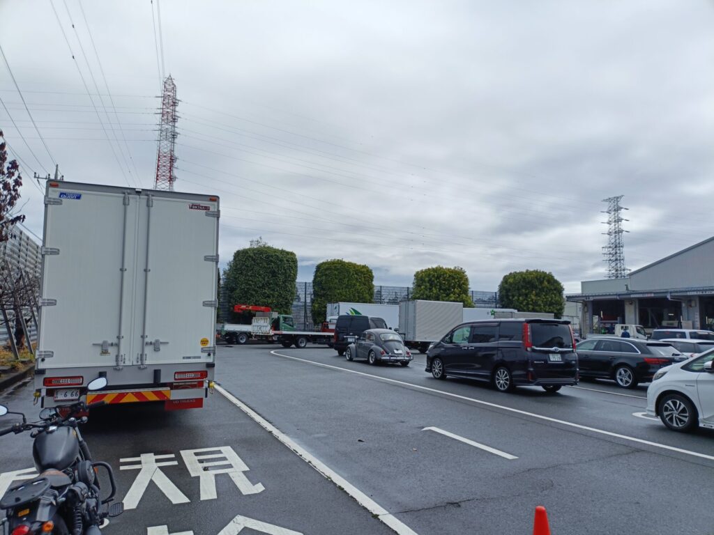 新車のトラックの列が出来ており、既に15分程並んで