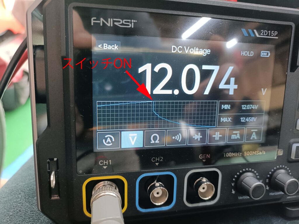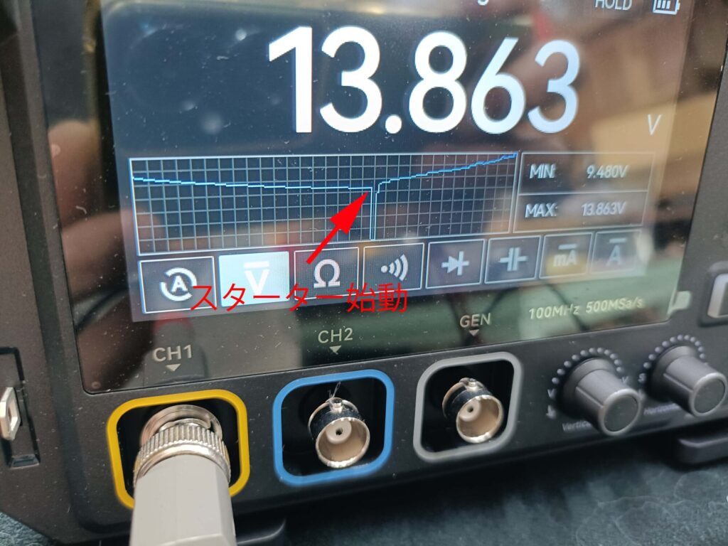 スターターモーターを回すと、ドスンと電圧が下がり、